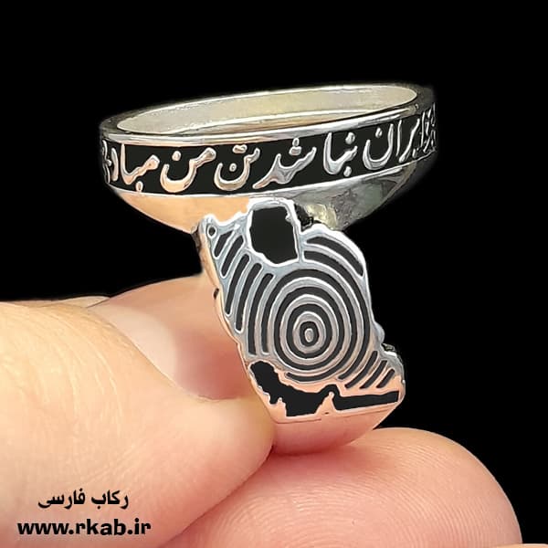 دور قاب مزین به شعر چو ایران نباشد تن من مباد است. این رکاب با وجود اینکه روکش است سیاه قلم کاری گردید. دارو سیاه قلم مواد شوینده و غیره روی بدنه و روکش انگشتر تاثیر ندارند. تنها موردی که باید برای مصرف رکاب های روکش نقره به آن دقت کرد عدم سایش است. این سایش گاهی حتی ناخودآگاه پیش می آید. به طور مثال استفاده همزمان از دو رکاب انگشتر کنار یکدیگر یکی از عوامل مخرب در رکاب و قاب های انگشترهای روکش دار است. برای نصب نگین روی این رکاب مردانه از چسب e8000 استفاده کنید. این چسب با دوام بالا به راحتی گوهر و نگین های شما را فیکس می کند. سایز رکاب طبق میل نمره انگشتر بین 63 و 64 مردانه است.