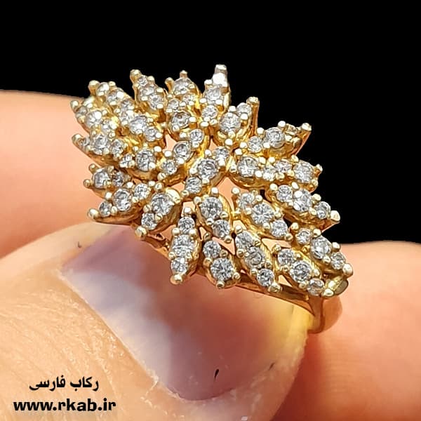 انگشتر زنانه مجلسی صدبرلیان مشابه طلا 18 عیار از دسته بدلیجات زنانه در فروشگاه رکاب فارسی است. روی انگشتر تماما دارای نگین های مخراجی ریز است که هر کدام از نگین ها توسط 4 چنگ مینیانوری مهار شدند. این نگین ها چسبی نیستند و قبل از ریختگری روی سطح موم قرار می گیرند.